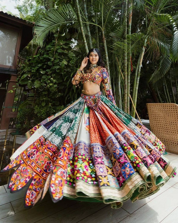 # LEHENGA : HEAVY BUTTER SILK WITH *DIGITAL PRINT * &. * 4 MTR FLAIR *FULLY STITCH * WITH * FULLY REAL MIRROR WORK*