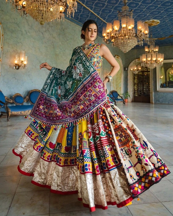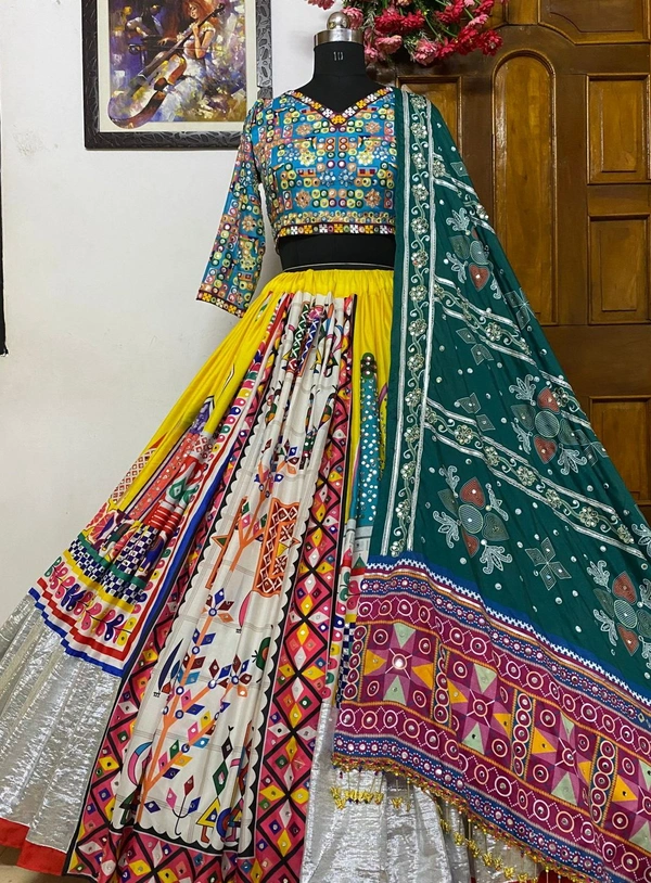 # LEHENGA : HEAVY BUTTER SILK WITH *DIGITAL PRINT * &. * 4 MTR FLAIR *FULLY STITCH * WITH * FULLY REAL MIRROR WORK*